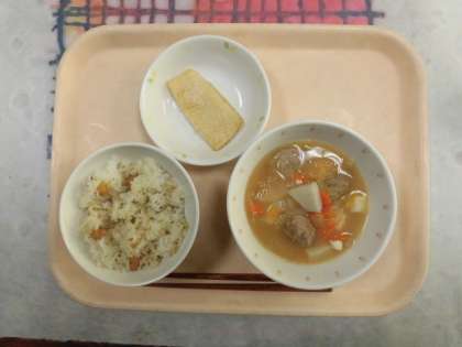 今日の給食は、「節分」にちなんだメニューです。”豆ごはん”には、大豆を使い”いわしのつみれ汁”には、すり身にしたいわしを使っています。いわしには、邪気(悪いこと)をはらうという意味があります。節分に豆を食べたり、豆をまくのは、災いをはらうという意味が込められています。