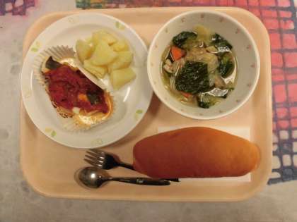 今日の給食の主食は、コッペパンです。パンは、世界各地で食べられています。地域によって使われる素材や発酵法(ふくらませ方)、焼き方などもそれぞれ違います。日本でもなじみのあるパンの種類は、フランスパン、クロワッサン、ナン、ベーグルなどがあります。