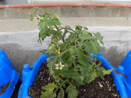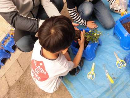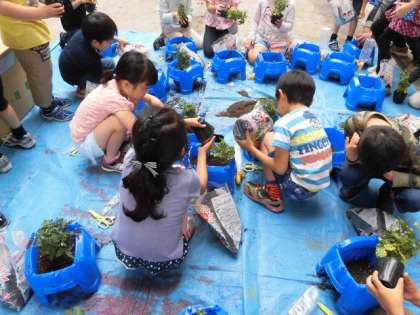 2年生は、生活科でミニトマトを育てます。今日、ミニトマトの苗を植えました。苗をポットからそっと出し、鉢に入れ、優しく優しく土をかけてあげました。中には、自分が植えた苗に「ミヤちゃん」「ミイニちゃん」と名前を付けて、そっとなでてあげている人もいました。「もっと大きくなってほしい。」「早く食べたい。」という声も聞かれました。