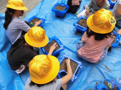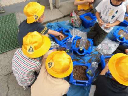 1年生は、今日、あさがおの種をまきました。植木鉢に土をいっぱい入れてから、指で小さな穴をいくつか空けます。そこへ一つぶずつ種を置き、上に土をかけてあげます。とても丁寧に作業することができました。これから水あげをがんばって、きれいな花が咲くのを楽しみに待ちたいですね。