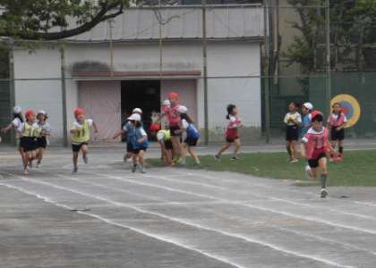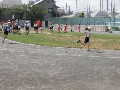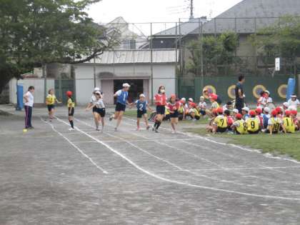 運動会では、1,2,3年生の低学年リレーと4,5,6年生の高学年リレーの2つの種目があります。低学年は中休みに、高学年は朝に、リレーの選手は練習をしています。バトンパスもだんだん上手になってきています。左の写真が低学年リレー、中央が高学年の男子、右の写真が高学年の女子の様子です。