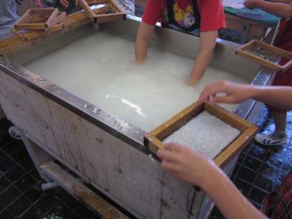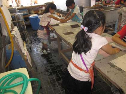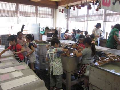 山崎小学校には伝統工芸室があります。そこで、全学年の子どもたちが紙漉を行います。今年の1年生も先日、2年生から紙漉を教えてもらいました。そして、今週は、自分たちだけで紙漉を行いました。とても丁寧に作業を行うことができました。自分で作ったはがきです。この後、乾燥させます。使うのが楽しみです。