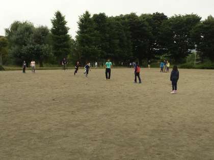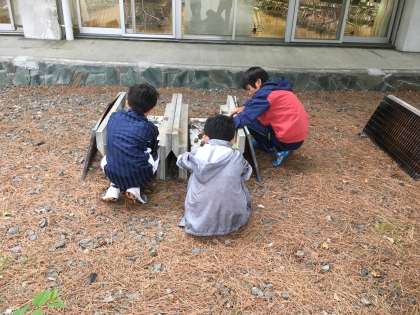 朝起きてから、学園の校庭で石と松ぼっくりで遊びました。その後は鬼ごっこ。朝から元気いっぱいです。
