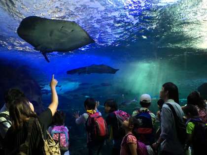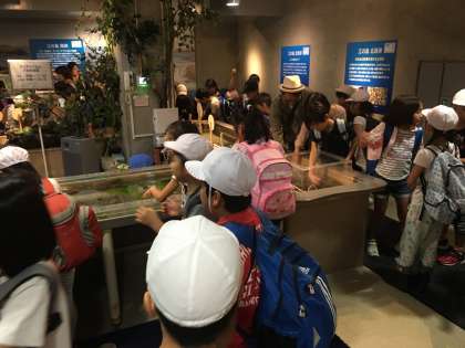 悠々と泳ぐ魚を見たり、海の生き物に触ってみたり。3、4年一緒のグループで仲良く行動しました。