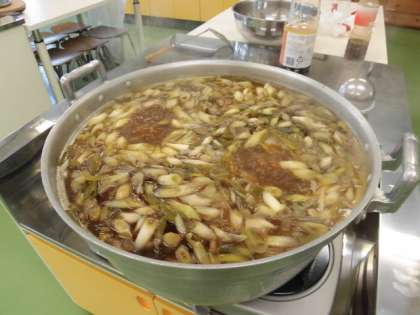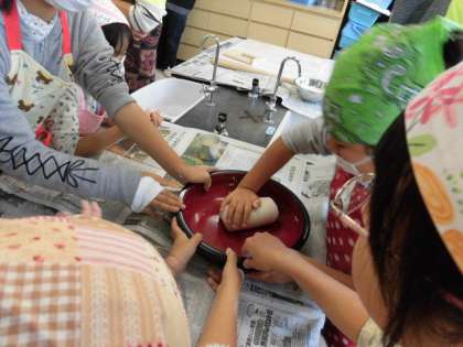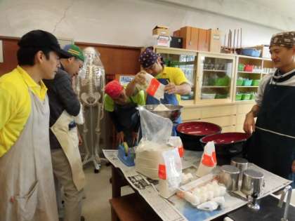 本日、山崎メンズクラブによる「そば打ち」がありました。舟形町から送っていただいた新そば粉をつかって、そばを打ちます。粉の用意、つけ汁作りはメンズクラブのお父様方、OBの皆さんがしてくださいます。そして、子どもたちの出番です。