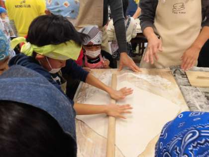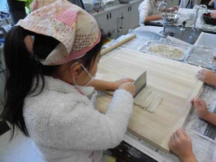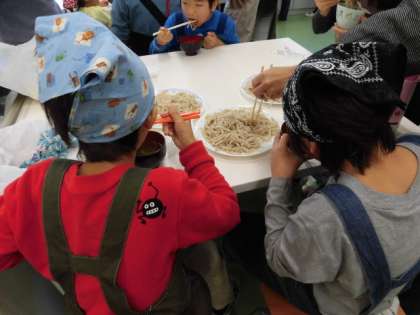 錬ったそば粉を丁寧に伸ばして、その後、切っていきます。自分たちで打ったそばを特製のつけ汁につけて食べました。おいしさも格別でした。山崎メンズクラブの皆様、ありがとうございました。