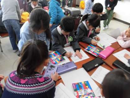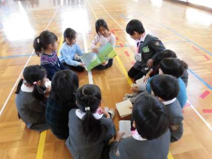 近隣の幼稚園の年長さんをお招きして、1年生は交流会を行いました。1年生の教室に案内し、ランドセルを背負ってもらったり、一緒に絵の具やひらがなの練習をしたりしました。練習をした絵本の読み聞かせも行いました。当日を迎えるまでがんばって準備をし、楽しみにしていた交流会。幼稚園の皆さんにも喜んでもらい、笑顔いっぱいの1年生でした。