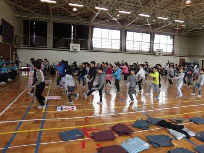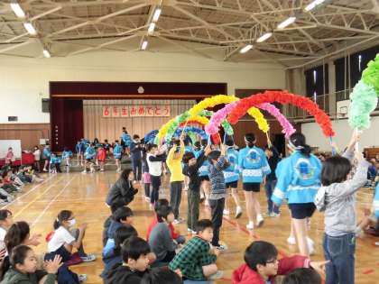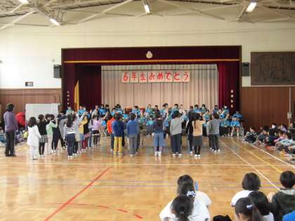 6年生への感謝の気持ちをこめた6年生を送る会を行いました。花のアーチで6年生を、迎えた後、それぞれの学年からのプレゼントの出し物をしました。写真は1年生と2年生です。