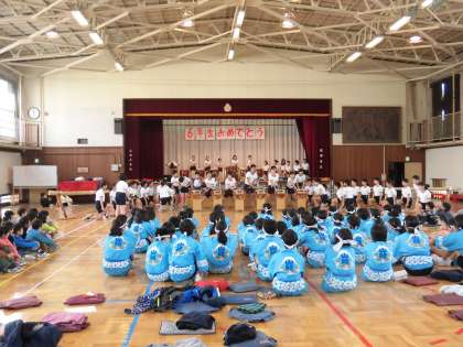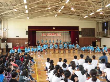 6年生を送る会の中で山崎太鼓のバトンタッチを行いました。6年生の山崎太鼓の演奏の後、6年生が5年生に太鼓のばちを渡しました。その後、5年生が「祝いの太鼓」を演奏しました。5年生、6年生から学んだことを生かし、はりきって太鼓をたたくことができました。