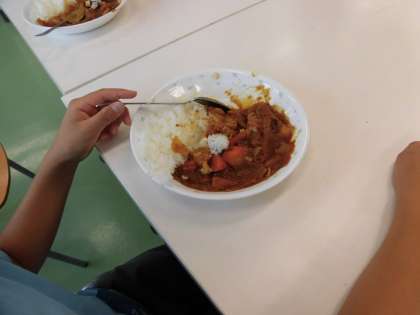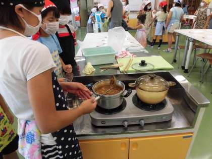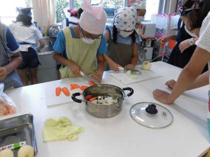 5年生は9月に川場移動教室に行きます。そのときに、飯ごうすいさんでカレーライスを作ります。そのことに備えて、家庭科でカレーライス作りをします。今日はまず、1組が行いました。なべでご飯を炊き、野菜を切ってカレーを作りました。おいしく食べることができました。