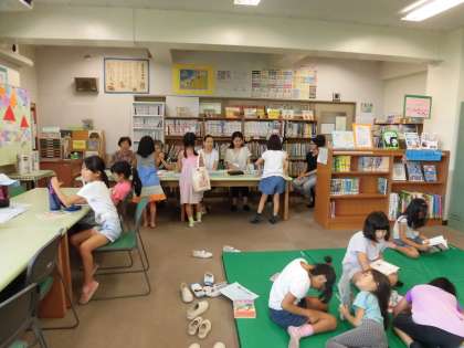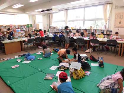本日から7月は31日まで、夏休みの図書館開放が始まりました。例年と同じく、学校運営委員の皆様を中心に、地域、PTAの皆様が運営してくださっています。初日の今日、大勢の子どもたちが訪れています。8月は21日から29日まで行っています。