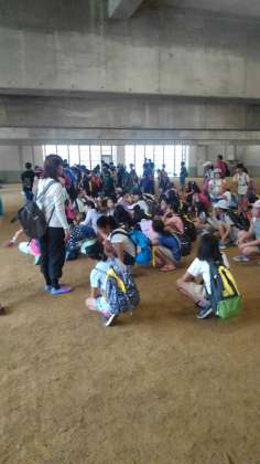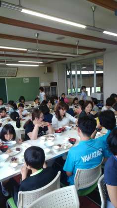 舟形交流2日目。実習館の食事の様子です。その後、体育館下のピロティに集まりました。いまのところ、予定通りの活動を考えています。体育館下にはスノーモービルも置いてありました。