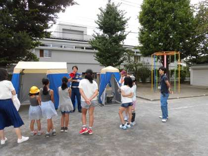 学校公開終了後、梅丘1丁目町会、代田自治会の方が中心となって、避難所運営訓練を行ってくださいました。学校公開後ということもあり、子どもたちも参加しました。防災倉庫を見たり、マンホールトイレの説明を聞いて、実際に腰掛けてみたりもしました。いざというときのために、避難所がどのようになっているかを知ることはとても大切なことです。子どもたちが参加できたことがとてもありがたかったです。