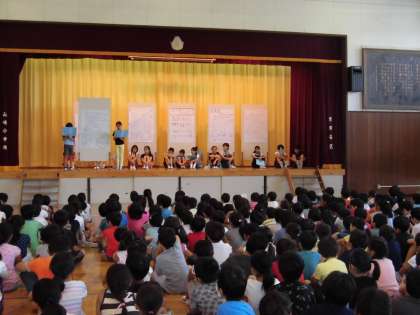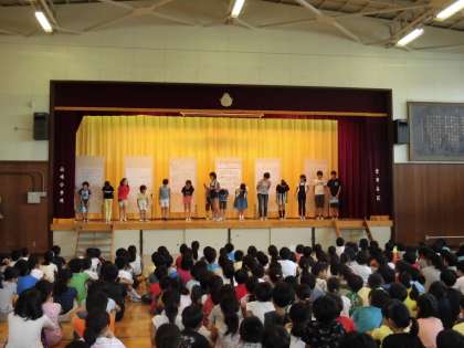 今朝の集会は、代表委員会によるユニセフ集会でした。代表委員が調べたユニセフの活動や世界の子どもたちの現状について全校のみんなに発表しました。困っている他の国の子どものために何かしたいという気持ちをもつことができたでしょうか。