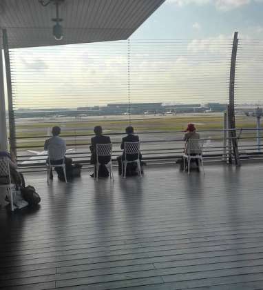 多くの飛行機の離発着を見ることができる展望デッキ。夢中になって見ています。