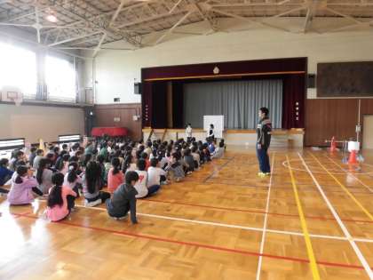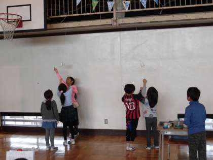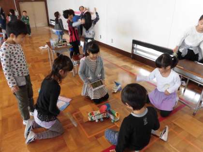 まずは、全体で2年生から説明がありました。1年生、ワクワクしながら聞いています。そして、それぞれが用意したおもちゃのコーナーで遊び始めました。