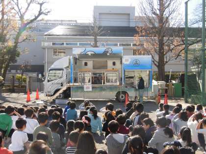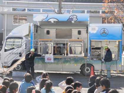 本日の避難訓練は、地震を想定して行いました。校庭に集合した後、区の防災担当の方による起震車についてのお話があり、先生が2人、体験しました。実際にこんな大きな地震がきたら怖い、自分の身を守るためにテーブルの脚にしっかりつかまっているのは大変などという感想を聞きました。その後、4年生みんなが起震車の体験をしました。