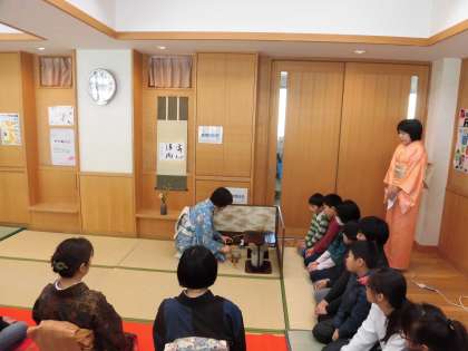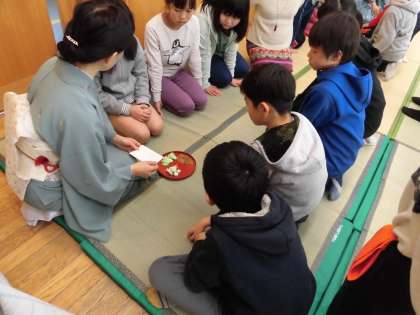 地域の方、学校運営委員の方を講師に、5年生は茶道を体験しました。お点前を見せていただいた後、自分たちもお茶を点てたり、いただいたりしました。