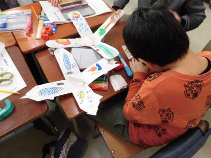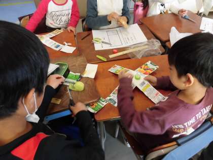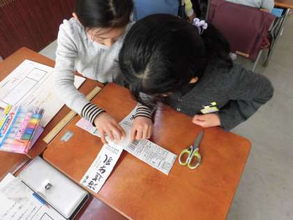 2年生が国語で学習したことを生かし、1年生に作り方を説明しながら、こまを作りました。2年生は、とても親切に1年生に教えてあげられました。
