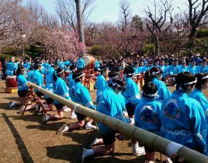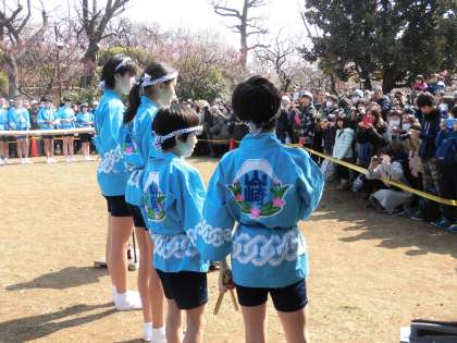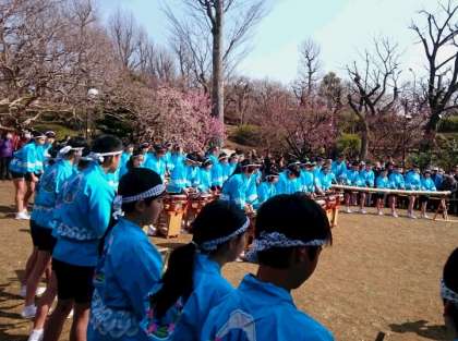 お天気にも恵まれ、羽根木公園での山崎太鼓の披露を無事に終えることができました。美しく咲いている梅を背景にした演奏。大勢のお客様にも聞いていただくことができました。