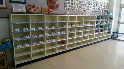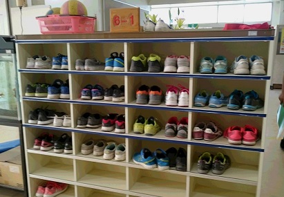 年度始め、6年生は全校のお手本として様々な場面でがんばっています。全校朝会では、おじぎの仕方の見本を見せてくれました。くつ箱も、くつや上ばきを揃えて、とても美しく入れています。1年生もそれを見習って、とても上手に上履きを入れることができています。