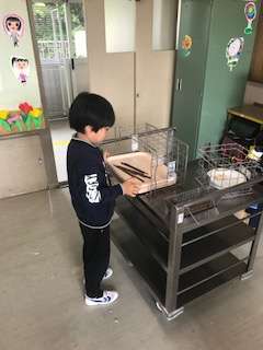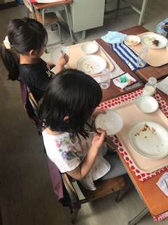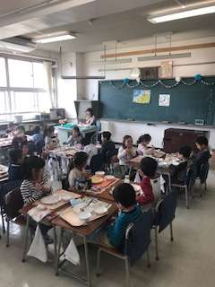 1年生の給食の様子を見せてもらいました。素晴らしい!みんな仲良く、お行儀よく、しっかり食べていました。お片付けも協力して上手に出来ています。