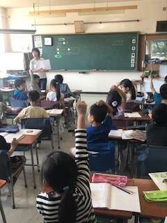 グーで手を挙げているのがわかりますか?ハンドサインで自分の意見を表しています。声を出さずに挙手で意思表示をしているので授業中とっても落ち着いた雰囲気になっていました。