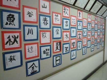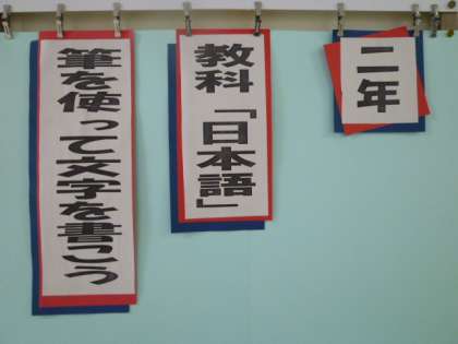 先日、「筆を使って文字を書こう」の学習に取り組みました。今までに習った漢字から、自分で選んだ漢字を太い筆と墨を使って書きました。初めての経験でしたが、一人一人の心のこもった作品ができました。職員室前の掲示コーナーに展示しています。