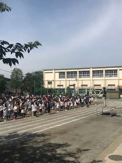 この写真は、最後の方を撮ったものなので写っていませんが、山崎小の全校朝会は、挨拶当番の子どもがノーマイクで今週のめあてなどを言って、その子の「おはようございます」に続いて全校児童が「おはようございます」を言って始まります。