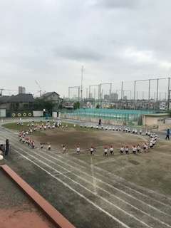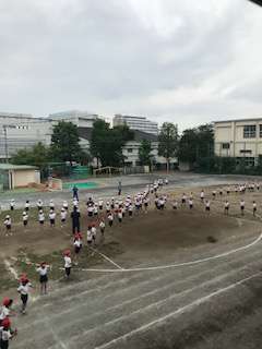 1.2年生の表現運動「Enjoyancing♪〜Goサインは1コイン」の練習風景です。みんなニコニコ頑張っています。2階から眺めていたら手を振ってくれる子が何人もいて練習の邪魔してごめんなさいね。1.2年生の体形移動って実はなかなか大変なんです。徒競走は40メートルですが、表現運動の体形移動はきっともっと走っています。そんな頑張りもいっぱい誉めてあげてくださいね。