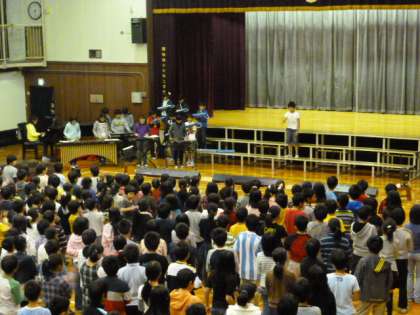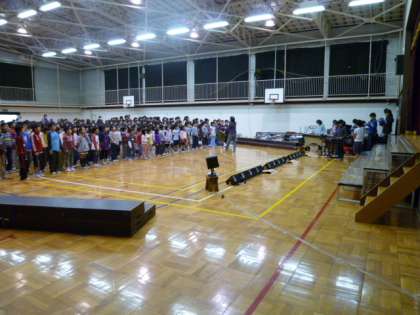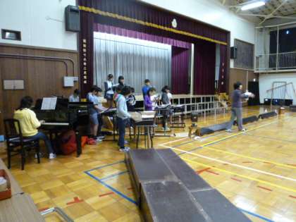 体育館で、学芸会の第1日目児童鑑賞日に合唱する「幕を開ける歌」と「幕をしめる歌」の練習をしました。音楽委員会のみなさんの伴奏に合わせて、学芸会の会場準備が進むフロアで、チームワークを大切に、元気よく歌いました。初めての学芸会を迎える、1年生・2年生の声も元気に響き渡っていました。