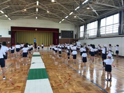 写真は準備体操を1年生と6年生のペアで一緒にやっているところです。