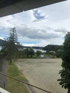 お部屋に入りました。これから開園式です。お部屋から河口湖が見えます。