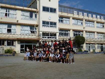 写真は、6年「魔法を捨てたマジョリン」の上演のあと、記念の集合写真撮影の場面です。