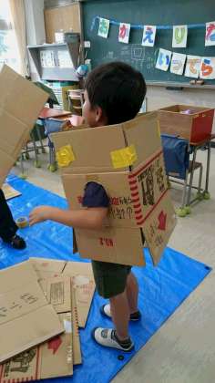 仲よし学級は4年生以上のお姉さんお兄さんが河口湖移動教室に行っていていません。1、2年のみんなで、今日は段ボールでいろいろなものを作って、仲良く遊んでいます。