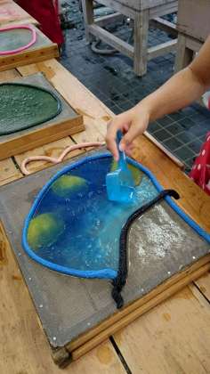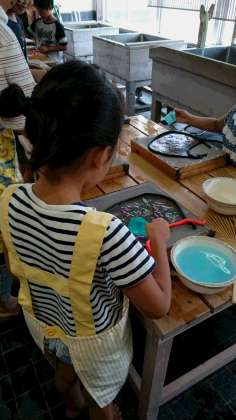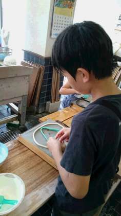 この夏休みも伝統工芸室主催の紙漉き教室が行われています。デザインを考えながら工夫して作っています。