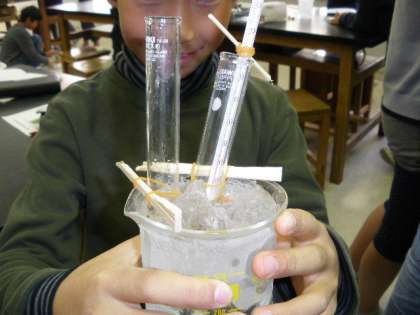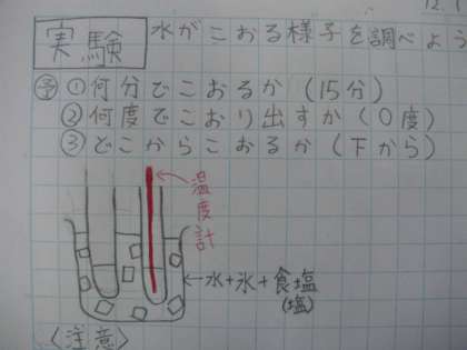 4年生での理科は「水の三つのすがた」の学習をしています。4年1組では、1日(水)理科室で、水を凍らせると水の体積はどのように変わるかを調べる実験をしました。ノートにしっかり予想をして実験で確かめました。氷を使う実験にみんな大喜びでした。