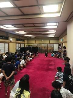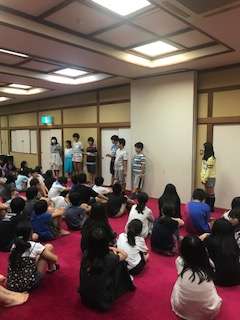 室内レクさんの司会で生活班対抗クイズ大会が始まりました。みんなで協力して楽しんでいます。仲よしな6年生です。