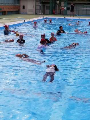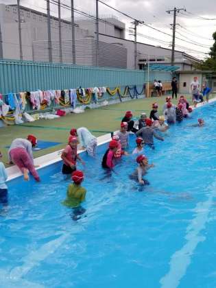 子供たちが服を着て、プールに入ると、「重い」「泳ぎづらい」「疲れる」などの悲鳴があがりました。服を着た状態では、いつもと違うことが直ぐに分かったようでした。