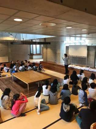 大広間にて、ビレッジでの過ごし方の説明を聞いています。