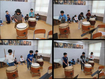 特別に音楽室をお借りして「仲よし太鼓」をしました。初めて太鼓を叩く子も多く、「どーんと とん とん とん はっ」というリズムを楽しみながら叩いていました。