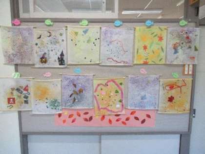 紙すきで作った作品ができあがりました!仲よし学級廊下掲示板に掲示しているので、ぜひ見に来てください。