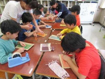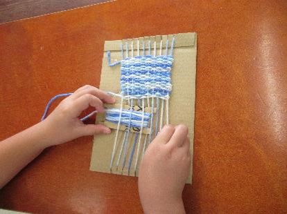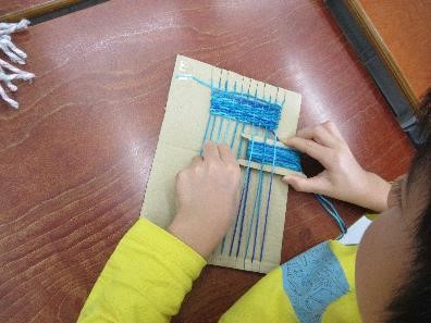今日の「毛糸で織ろう」では、縦に織ってある毛糸に横から毛糸を通す作業をしました。「難しそう」と言っていた子も、黙々と毛糸を織っていました。