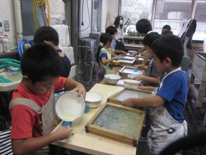 先日、1年生は紙すきの学習を行いました。1枚目は伝統工芸室の先生と一緒に、2枚目は自分だけで作れるか挑戦です。先生のお話をしっかり聞いて、やり方を覚えられたので、1人でも自信満々に取り組めました。