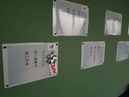 9月に3、4年生で葛西臨海水族園に行った際、ペンギンを見ながらグループで作った川柳(24点)が廊下に並びました。