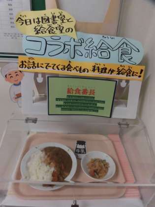今日は図書室と給食室が協力したこんだてのラストをかざる「カツ!カレーライス」です。