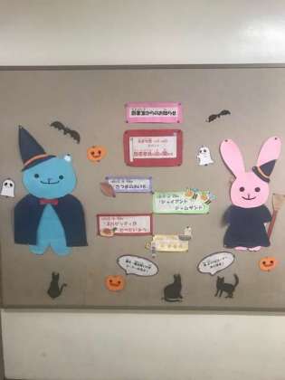 図書室前の掲示板です。可愛い表示に興味ひかれて新しい本を手に取れるといいですね。