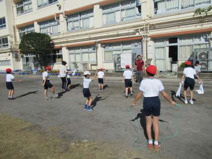 来週の山崎スポーツタイムに向けて、体育の時間にリズムなわとびの練習をしました。どんどん上達しています!