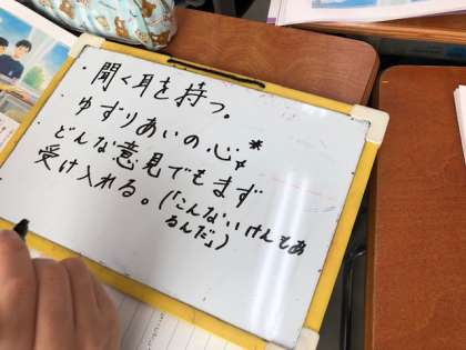 班ごとに「良い話し合いの条件」をホワイトボードに書き出し、学級で共有しました。