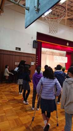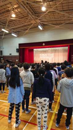 音楽朝会。「マイバラード」を歌いました。とてもきれいな歌声が体育館に響きわたらりました。音楽朝会の歌は、朝会の度に上手になっています。